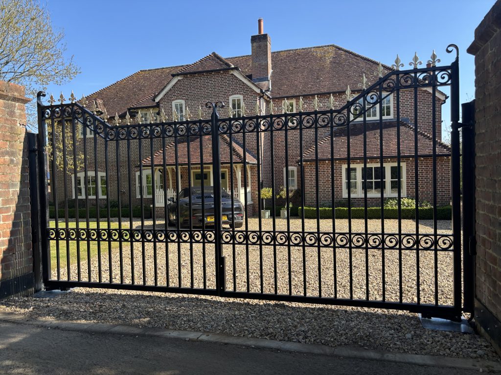 Double wooden gates with ram automation, Intercom entry, long range remote control and automatic exit. All on Solar Power.